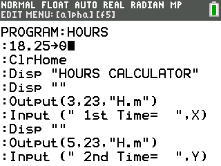 A TI-BASIC wage calculator that computes hours worked and pay earned from start/end times.