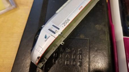 Front metal pieces removed to allow the front LED assembly to sit flush against the Acela's light pipes for front headlights and tail lights.
