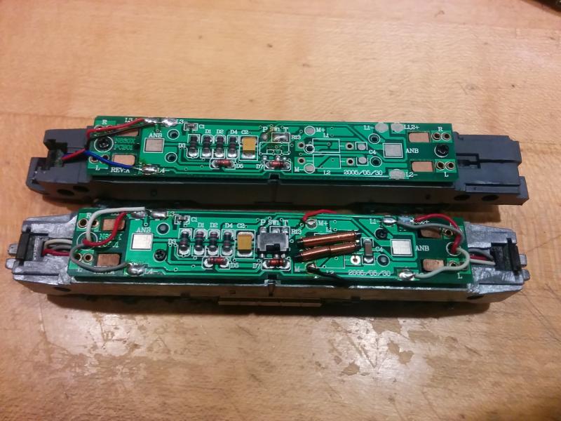 Comparing boards more closely. Note that track/pantograph switch pads are bridged with solder in Acela locomotive.