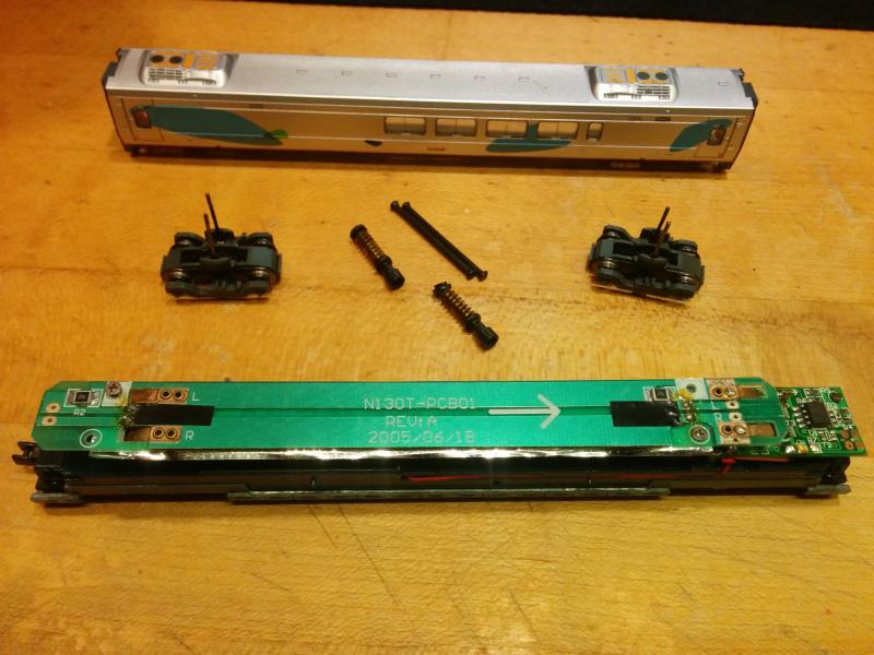 A reassembled, now-dummy cafe car. One of the DCC leads has been snipped, and the worm gears and drive shafts have been removed.