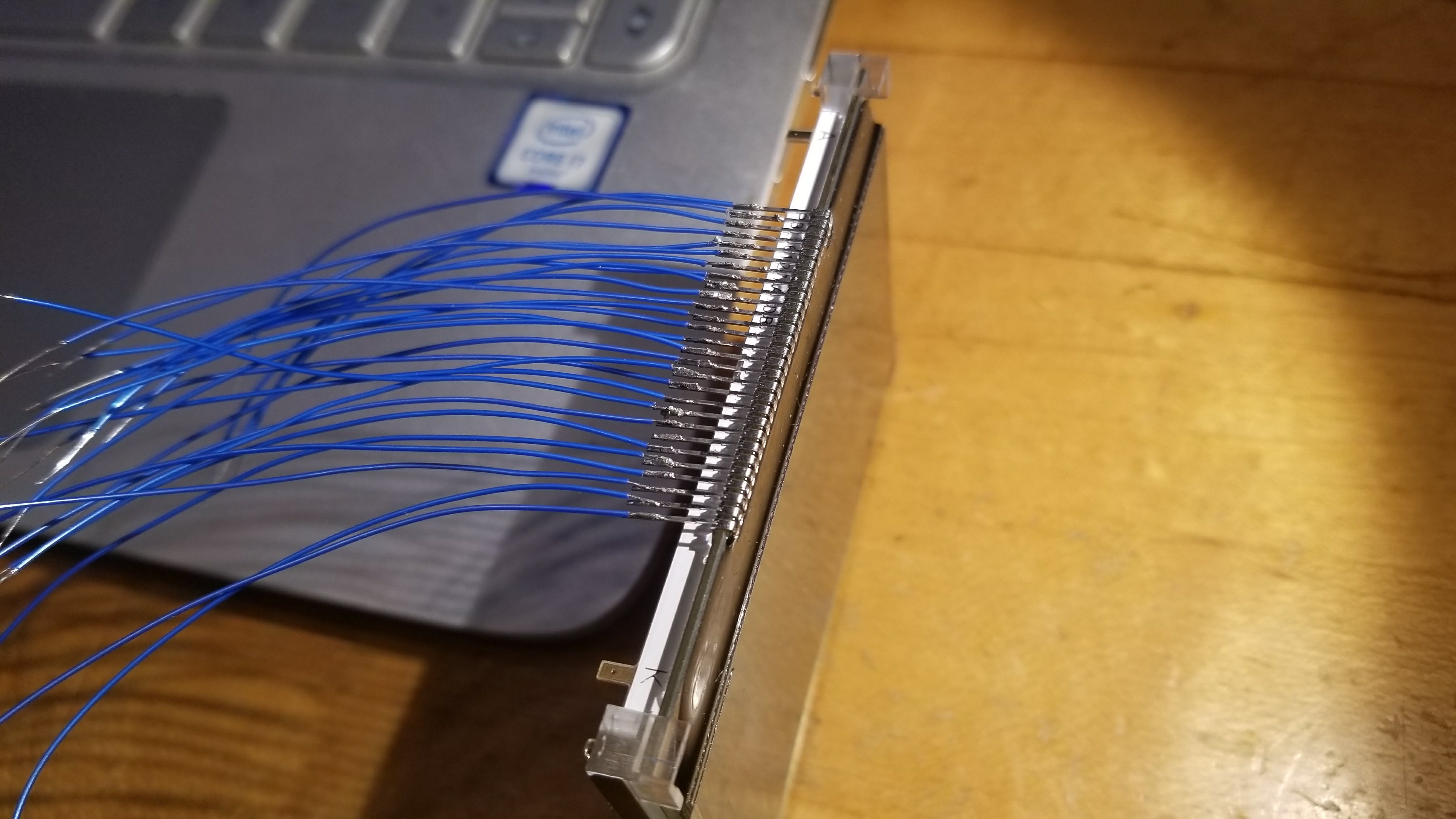 Soldering 28 wires onto a 64128M FC BW 3 LCD module for testing.
